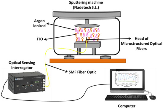 Figure 2 shows the set up used during the construction process. It consists of a commercial optical interrogator for optical fiber sensors (Smartec SM 125, Lugano, Switzerland) and the sputtering machine that was described above. The optical interrogator was used to illuminate the MOF sensors and to record their reflected optical power; at the same time, their signals were processed with a computer using the commercial software Matlab® (Mathworks, MA, USA). Due to this set up, it was possible to verify in real time that the amplitudes of the reflected optical power from the sensors were high enough to characterize the sensor response.