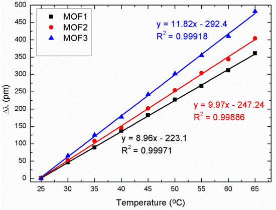 The set up proposed to carry out the VOC measurements (see Figure 3) was an in-reflection one using the same commercial optical interrogator (Smartec SM 125). As explained at the beginning of the section, it was used both to illuminate the MOFs as well as to analyze the sensor responses; in this manner, it was possible to simultaneously measure the response of the three different sensors when they were exposed to VOCs with the same temperature and humidity values. These responses were performed placing the sensors in a hermetic metallic cell (avoiding any external contamination as, for example, external gases and ensuring constant humidity and temperature values during the measurement process). At this point, it is important to mention that all sensors used in this paper are sensitive to temperature as all of them were made of a MOF–FP cavity. Because of this reason, if the temperature varies during the exposure of the MOF sensors towards ethanol, it is necessary to use another sensor as a temperature reference in order to avoid the temperature crosstalk and its influence on the final sensor sensitivity, as Reference [37] proposes. Figure 4 shows the temperature characterization curves for the three sensors after the deposition process. Their sensitivities, when they were exposed towards temperature from 25 °C to 65 °C, were: MOF-1: 9.025 pm/°C; MOF-2: 10.1 pm/°C; MOF-3: 12.05 pm/°C.