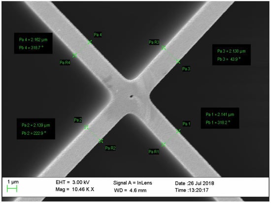 To prepare the different MOF sensors, ITO nanofilms were deposited following the procedure explained in the Section 2.3. At this point, it is very important to remark that the goal of this paper was to improve the sensitivity of the MOF sensors only by means of its structures; the effect of other important factors on the MOF sensor sensitivity, such as the thickness of the nanofilm, will be studied in future papers. For this reason, and in order to obtain the same thickness for every sensor, sputtering technique was selected. This technique allows the final thin film thickness to be controlled with high accuracy and it can be considered a reproducible process [39], but the structure of the MOFs (core and bridges) do not always present the same dimensions (due to the custom fabrication process). The construction parameters were set based on previous studies with the intention of depositing a thickness which provides an optimal sensitivity. These parameters were the same for the three fibers (see Section 2.3), so that for a certain sputtering time, the final thickness was assumed to be similar in the three cases. Following these considerations, the film deposited onto MOF-3 was determined from images captured by a scanning electron microscope as follows: firstly, the width of each of the four bridges of MOF-3 was measured and averaged (1.158 ± 0.009 µm) prior to the coating deposition in order to minimize the possible error in this measurement; secondly, after the sputtering deposition, the average width of the four bridges was measured again (see Figure 5). To determine the real value of the MOF-3 ITO nanofilm thickness, both values were subtracted (average width before and after deposition); the result obtained was 500 ± 17 nm.