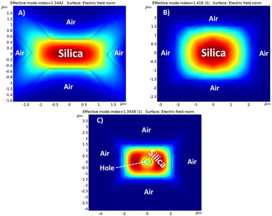 With the purpose to study the effect of the suspended-core fiber geometry on the coupled optical power and on the evanescent guided field of light, mode field distributions were simulated for the three different types of fiber (without and with ITO nanofilm) as described in Section 2.4.