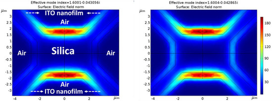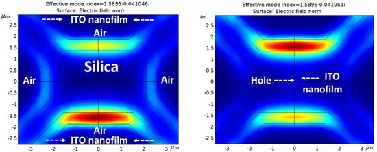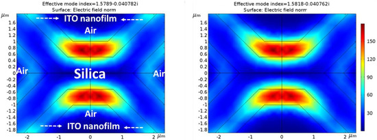 Figure 7 illustrates the new optical field mode distribution of MOF-1 with ITO nanofilm. As it can be directly inferred from Figure 7, the waveguide properties have been highly modified: the light is no more guided by the silica structure but the ITO thin film, becoming a one layer antirresonant optical waveguide (ARROW) [40]. Since ncore < ncladding (where core is made of silica and cladding of ITO), total internal reflection does not occur at the core–cladding interface, and therefore no guided modes can propagate in the low-index core. However, these structures would support leaky-mode propagation [41]. In addition to this, Figure 7 indicates that not only the fundamental LP01 (symmetric) mode is being propagated through the fiber in the shown cases but also the LP11 (asymmetric) mode; LP11 propagated mode presents an asymmetric distribution with orthogonal phases between maximums in the same location as LP01. Generally, LP11 presents lower optical power (one order of magnitude) than LP01, but in this case, due to the dimensions of the new propagating structure, both optical powers are closer to interfering significantly with each other. As expected in ARROW structures, LP01 and LP11 can present very similar effective refractive indices [42] and appear simultaneously interfering one with the other. This is due to the dimensions of the fiber and the presence of two guiding areas isolated through a non-guiding region (in this case the original silica core). Both regions propagate the LP01 and LP11 modes within the same effective refractive index and therefore, they appear simultaneously interfering with each other. As it can be noticed, the effective refractive index of the propagated modes has been significantly increased as expected due to the higher refractive index of the ITO waveguide thin film. Moreover, the optical power of the guided modes has also been increased up to values of 147 V/m with evanescent fields of 70 V/m regarding the MOF-1 values obtained without ITO thin film (see Figure 6A). The former evanescent field (MOF-1 without ITO deposition) couples inside the ITO nanofilm and is propagated along the deposition, forming the new ARROW waveguide.