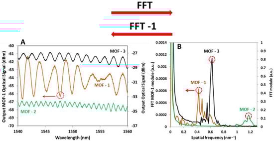 The sensors were characterized toward saturated atmosphere of ethanol using the fast Fourier transform (FFT) [39]; it is possible to apply this technique because the output optical signals of the three MOFs obtained after ITO deposition process describe a periodic sinusoidal function (see Figure 10A). The distance between peaks in the interference pattern is very small (a few nanometers) and this fact makes it very difficult to use traditional techniques based on registering the wavelength shift of remarkable points of the interferometric spectral response, such as a transmission valley. As can be observed in Figure 10B, the FFTs of the three MOFs’ optical spectrum present a principal component in the transformed domain, which corresponds to the main FP interference frequency.