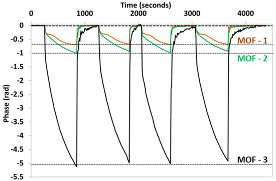 With the aim of confirming the ideas that are derived from previous theoretical studies, every sensor was exposed to saturated atmospheres of ethanol; the three MOF sensors showed different FFT phase spectral shift responses (see Figure 11). In the first case, MOF-1 showed a maximum variation of 0.685 radians, which implies the lowest sensitivity among the sensors. As previously mentioned, it is a consequence of the dimensions of the core; it has an original low evanescent field power which makes it difficult to couple light into the ITO thin film. Sensors fabricated with MOF-2 and MOF-3, with wider cores, showed higher sensitivities. Although the external dimensions of the cores of these last fibers are similar, the maxima phase shift obtained for MOF-3 (5 radians) is five times greater than the maxima phase shift obtained for MOF-2 (1 radian) and four times greater than previous papers published when MOFs are used to detect VOCs [43]. This result is in accordance with the results of the theoretical study performed in previous sections and reinforces the hypothesis that the increment in the sensor sensitivity is produced by the effect of the MOF-3 core hole. This hole produces a loss of light confinement and an increase in the evanescent field power (in comparison with the case of MOF-2). Due to this fact, when this power (the evanescent field power of MOF-3 without ITO thin film) is coupled to ITO thin film, the penetration depth of this evanescent field is increased and consequently, its interaction with ethanol occurs in a more optimal way. Furthermore, the sensors’ responses were repetitive, and every sensor always reached the baseline in a short period of time (below 100 s) after every exposure to ethanol.