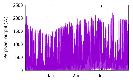 Similar to 2016, we also collected the on-site sensor measurements. However, we do not use them to train our model. Thus, instead, we present the actual hourly PV power output Figure 6 as the ground truth to be used in training our forecast model. The PV power output measurement data are missing from 12 July through 22 July, due to the power conditioning system (PCS) device breakdown. The PV testbed installation specifications are given in Table 2. Notice that the capacity of the facility is half of that in 2016.