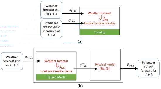 Typically, the PV power output forecasting takes a two-staged approach [,,]. In the first stage, an NWP is created based on various techniques such as Autoregressive (AR) models, artificial neural networks (ANNs) [], Fuzzy Logic, and hybrid systems [,]. The accumulated historical observations and meteorological data for the installation site are used to construct the regression model. In the second stage, based on this NWP, a forecasting algorithm typically implemented in commercial software predicts the future PV power output. In our existing system shown in Figure 1, we also run a two-staged forecast model depicted in Figure 7b. During training, the historical weather forecast made at t with the target horizon h and the corresponding on-site measured irradiance are used to train the irradiance forecast model (Figure 7a). After training, the system uses the trained model at to forecast the irradiance . For , we use the Gaussian Process regression model []. It predicts the irradiance to be the one that matches the most similar input values in the historical data. The inputs W are composed of the following: