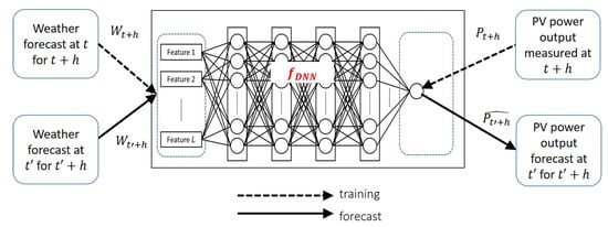 In order to tackle the aforementioned cost issues of sensor-involved forecasting, we explore a DNN-based sensorless alternative. The method is depicted in Figure 8. It directly trains the forecast model by using only the historical weather forecast data and the matching historical PV output as ground truth. After training, we use to obtain the forecast at . Because the day-ahead forecast is of primary interest to grid-connected buildings, we focus on the horizon of h.