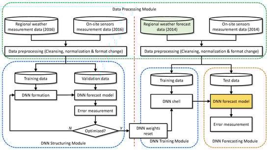 Figure 9 summarizes how we proceed to determine the architecture of the DNN for and then train it. Note that we use the 2016 data set to determine the DNN architecture, and the 2014 data set to train the DNN for forecasting use. There are two reasons that we use the data sets for different purposes. First, the two data sets have different structures and contents as the 2016 data from the KMA are actual measurements, whereas the 2014 KMA data are forecasts (see Table 1). Second, the number of solar panels in 2016 in the system doubled from 2014, and so did the maximum power output (see Table 2). Due to these incompatibilities, we cannot directly combine the two years’ data to train a single model. However, the two data sets represent the fundamentally identical dynamics, so we believe that the DNN architecture that works best for the 2016 data set will be also good to capture the dynamics in the 2014 data set. Lastly, before using the data, we removed faulty data entries from the two data sets. We also eliminated the entries that only have either the weather data from the KMA or the sensory data from the installation. As for the peak power difference, we can circumvent the problem by normalizing the data, which also helps reduce the training time [,]. For instance, the PV power output in the 2014 data set was normalized with the maximum value of 1.224 kW mapped to 1. These normalized data are used for evaluation in Section 4.3 as well. For the final forecasting output, however, we reversed the normalization process so that absolute forecast values are obtained. Since the main focus of this paper is in comparing the DNN-based sensorless PV forecasting vs. sensor-assisted two-staged models, we do not apply more sophisticated data pre-processing techniques such as Wavelet Decomposition [,,] to improve the forecast performance. However, we cannot emphasize the importance of the pre-processing too much, as it plays an essential role in the accurate forecasting.
