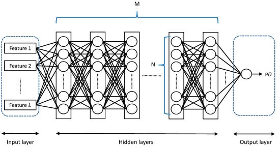In the PV power output forecast literature, many previous works employ the long–short term memory (LSTM), Elman network, or the recursive neural network (RNN) in general. They are a popular DNN type to learn the time dependent nature of solar radiation [,,,,,,]. However, considering the targeted hourly forecast under the much coarser time grain of 3 h in the weather forecast data, we decided not to rely on the time dependency between adjacent data entries. A positive side of sacrificing the time dependency is that the model will not be affected as much when the weather condition wildly varies between two forecasted hours. Without the time dependency between data entries, perhaps except through the time indices (month, date, and hour), we can choose a feedforward network for the DNN type. In this paper, we employ the Multi-Layer Perceptron (MLP). Note that our focus is not in proposing a DNN model having a better precision than others, or improving its learning speed. Rather, we aim to show that large DNNs can replace the traditional sensor-based approach by coping with coarse-grained weather forecast, whatever DNN type is selected.