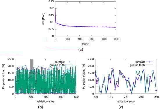 Figure 12a shows the loss value as a function of the epochs. We observe that the loss gradually decreases until . Then, we apply this trained model to predicting the PV power output for the entries in the validation data set. Figure 12b and c show the result. We see that the prediction roughly matches with the power output values in the validation data set. Note that the validation entries are not in the chronological order, as we put randomly selected entries in each batch in both training and validation.