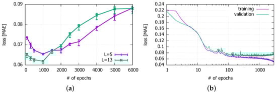 In order to determine the precise number of epochs to avoid overfitting, we can more extensively search the epoch space and use the early stopping criterion []. In Figure 13b, we can find the point where the loss value begins to increase for the validation data set. The MAE for the validation set is stable (i.e., almost no change) between 500 and 1200 epochs, but starts to increase beyond 1200 epochs. The minimum loss occurs at . However, the MAE value there is similar to what we achieve with the 1000 epochs that we decided on with the trial-and-error method.