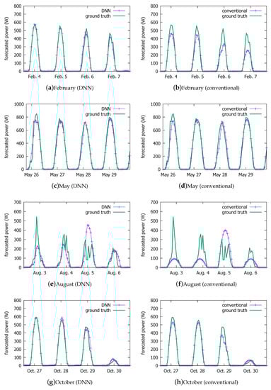 Figure 15 magnifies a few days from the above forecasts by the two schemes, and puts them against the ground truth. For readability, we plot their predictions for approximately four days in each season. We list the weather and its changes that are forecasted by the KMA in Table 6. When the weather is bad, the prediction becomes more difficult for both models. In particular, the summer days (e and f) pose the greatest challenge due to the Monsoon climate. The current system tends to more severely underestimate the PV power output under bad weather conditions (6 and 7 February, and 3, 4, 6 August ). However, the DNN model more closely follows the peaks than the conventional model, except on 5 August when it overestimates slightly more than the current system.