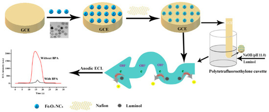 Among these, superparamagnetic Fe3O4-nanocrystals (Fe3O4-NCs) have gained growing interest for electrode modification due to their unique properties, including easy preparation, good biocompatibility, conductivity and non-toxicity. The successful applications of magnetic Fe3O4-NCs in the detection of thrombin, pesticides, protein and phenolic compounds et al., have been reported [22,23,24,25]. Nevertheless, to the best of our knowledge, the anodic ECL of luminol combined with superparamagnetic Fe3O4-NCs has yet to be used to improve the sensitivity and selectivity of BPA determination. Therefore, in the present study, the superparamagnetic Fe3O4-NCs were firstly synthesized, which could be conveniently deposited and regularly attached to the electrode surface owing to the excellent magnetic properties. Furthermore, a novel anodic ECL sensor based on a glassy carbon electrode (GCE) coated with superparamagnetic nafion/Fe3O4-NCs was fabricated and exhibited excellent sensitivity, selectivity and reproducibility for BPA determination in real samples. The procedure for the materials preparation and ECL sensor fabrication were illustrated in Figure 1.