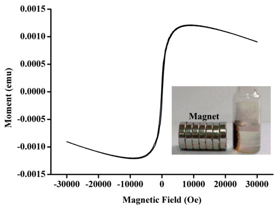 VSM magnetization curves of Fe3O4-NCs. The inset shows the separation of a solution of Fe3O4-NCs in the presence of an external magnetic field.