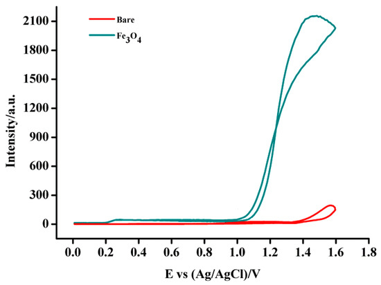 ECL intensity of luminol in bare GCE and Fe3O4-NCs/GCE under 0.01 M NaOH (pH 11.0) and 6.0 × 10−6 M luminol.