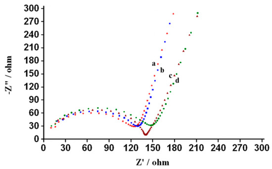The electrode modification and the ECL mechanism were monitored through EIS. From the Nyquist plots in Figure 5, a typical semicircle, which is equal to the electron-transfer resistance [30,31], was observed for all modified GCEs. The semicircle diameters of the bare GCE, nafion/GCE, Fe3O4-NCs/GCE and nafion/Fe3O4-NCs/GCE were about 150, 130, 140 and 123 Ω, respectively. This finding suggests that nafion and Fe3O4-NCs were successfully immobilized onto the GCE surface and that the nafion/Fe3O4-NCs/GCE possessed the best electrical conductivity. After separately depositing the nafion/Fe3O4-NCs, nafion and Fe3O4-NCs composite films onto the GCE surface (a–c in Figure 5), the impedances of the electrodes were decreased in contrast to the bare GCE. These results indicated that both nafion and Fe3O4-NCs positively affected conductivity and generated the gain effect, which enhanced the electron transfer rate and decreased the electron flow resistance. However, the semicircle diameter of the nafion/Fe3O4-NCs/GCE was smaller than that of the Fe3O4-NCs/GCE, indicating better charge transfer in the nafion/Fe3O4-NCs/GCE compared with the Fe3O4-NCs/GCE. This phenomenon can be ascribed to the fact that nafion allows the nafion/Fe3O4-NCs/GCE film to facilitate the electron transfer [32] and the nafion/Fe3O4-NCs/GCE possessed the best electrical conductivity. On the basis of above results, the strong anodic ECL resulted from the highly efficient electrocatalytic effect of Fe3O4-NCs on luminol.