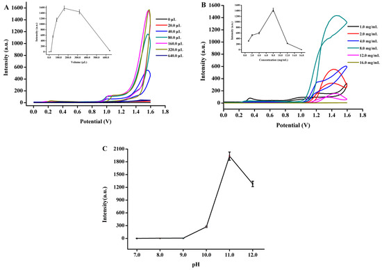 The effect of the luminol concentration, Fe3O4-NCs concentration and pH of the reaction solution on the ECL intensity of the fabricated nafion/Fe3O4-NCs/GCE was determined to improve the sensitivity and selectivity of the ECL sensor. As shown in Figure 6A, the anodic ECL intensity of the fabricated ECL sensor increased until reaching a maximum of 160.0 μL as the luminol volume (5.0 × 10−5 M, dissolved in 0.01 M sodium hydroxide solution) in the polytetrafluoroethylene cuvette was increased in the range of 0.0–160.0 μL. However, ECL intensity decreased as luminol volume was further increased to 640.0 μL accompanied with the highly unstable ECL signal. Therefore, the optimum luminol volume of 160.0 μL is suitable for the fabrication of the biosensor.