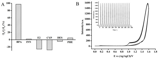 Selectivity (A) and stability (B) of the developed ECL sensor for BPA detection. Scan rate: 100 mV/s.