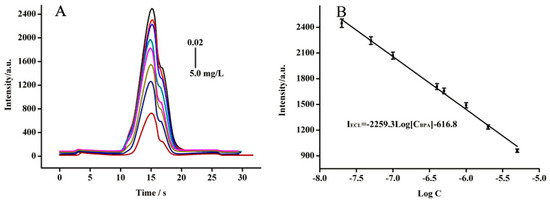 The coated amount of Fe3O4-NCs on GCE was further optimized. As shown in Figure 6B, ECL intensity gradually increased as Fe3O4-NCs coating concentration was increased from 1.0 × 103 mg/L to 8.0 × 103 mg/L. ECL intensity decreased as this concentration was further increased. This result can be ascribed to the fact that increasing the concentration of Fe3O4-NCs coating increases film thickness due to the restack and electrochemical impedance that decreases the energy transfer during ECL [11]. Hence, a concentration of 8.0 × 103 mg/L Fe3O4-NCs was selected for GCE modification.