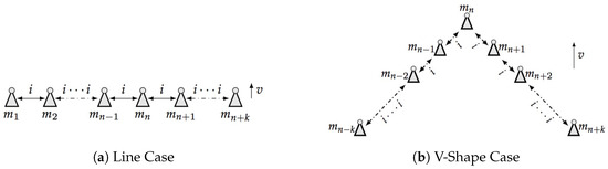 By assigning as a member among the swarm, the left part members are while the right part members are , the processing procedure of v-shape case and line case are similar in most respects. The shape of the coverage area may differ according to the final formation of the swarm. Details will be shown in the following sections of results and discussions.