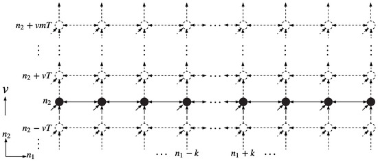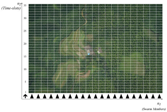 Assume for a moment the line-formatted swarm motion is in the direction of the axis in Figure 3. Then all sampling lattice locations , with fixed are represented by the same swarm agent, uniquely identified as agent . Sampling at location then just happens t time units after sampling at , where v is the agent speed in the direction, and agent speed is defined merely as sampling periods per time. In this case, only the horizontal part of Equation (2a) requires communication between neighboring agents. All the computations are executed entirely inside each line agent. Therefore this scheme (unlike the 2-D process before) has a sampling and processing rate limit that is dictated by the swarm speed itself. A slow-moving swarm takes more time to arrive at the next sampling instant and thus has plenty of time for propagating the state value from left to right, vice versa, or in both directions. The question of causality choice is almost trivial for this case, only in the first and second quadrant, since the swarm does not have any information about the un-scanned area.