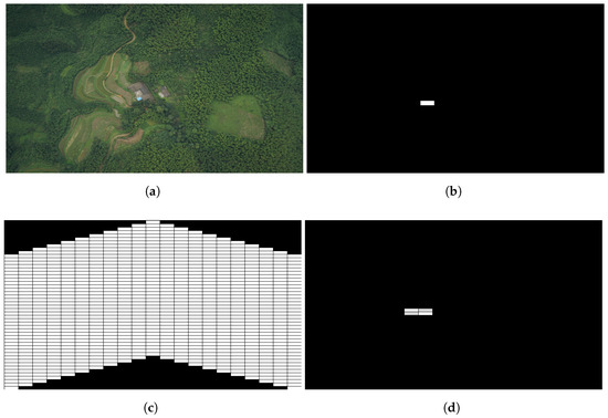 Simulated Distributed Salient Region Detection of Swarm Formations. (a) Original Scene; (b) Detection Result of Line Scan Case; (c) Coverage Area of V-Shape Scan Case; (d) Detection Result of V-Shape Scan Case.