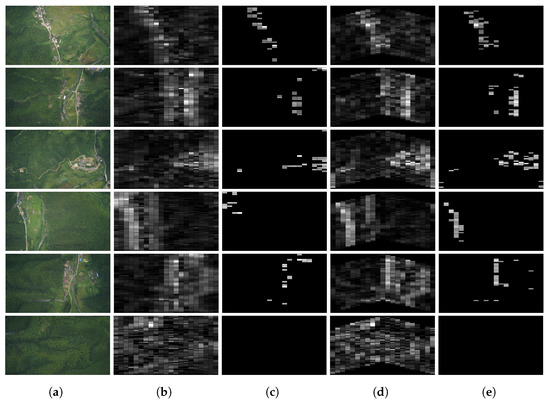 Formation Based Distributed Salient Region Detection. (a) Original Scene; (b) Line Case; (c) (Line); (d) V-shape Case; (e) (V-shape).