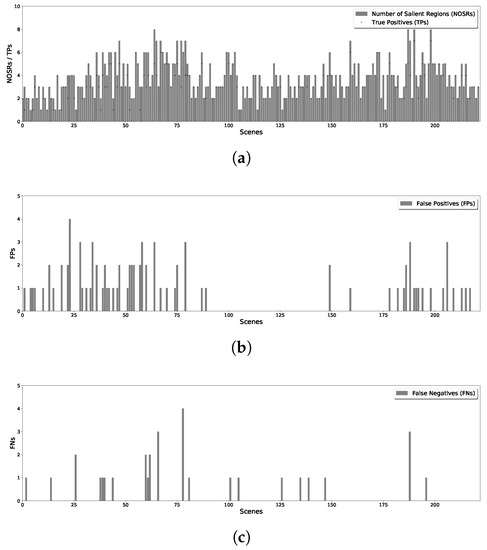 By splitting all the images in the dataset, and running the proposed methods for line and v-shape case, we get the results of detected salient regions. With comparing with the results with manually labeled salient regions of original scenes, the statistical results of proposed methods are shown in Figure 7 for line case and Figure 8 for v-shape case respectively. Figure 7a and Figure 8a illustrate the number of salient regions (shown with the bars) and the detecting true positives (shown with the dots) in each scene. Figure 7b and Figure 8b give the number of false positives for line and v-shape case respectively. We can see the number of false positives in the v-shape case is higher than that in line case. Since the state propagation direction is bent, the reference blocks are not exactly left or right blocks. It makes the salient value is not the same as the line case, use the same threshold to segment the saliency map will get different results. Additionally, Figure 7c and Figure 8c show the number of false negatives of those two situations. This number of v-shape case is also more significant than line case because there are some blind areas of v-shape scanning. With long distance scanning, the blind areas can be ignored.