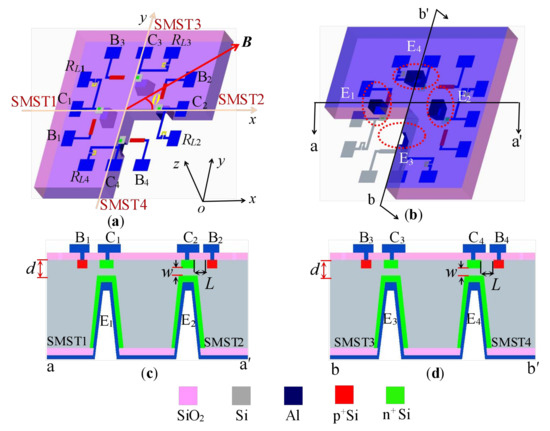 The basic structure of the monolithically-integrated 2D magnetic field sensor: (a) front of the basic structure; (b) back of the basic structure; (c) cross-section along aa′; (d) cross-section along bb′. SMST, silicon magnetic sensitive transistor.