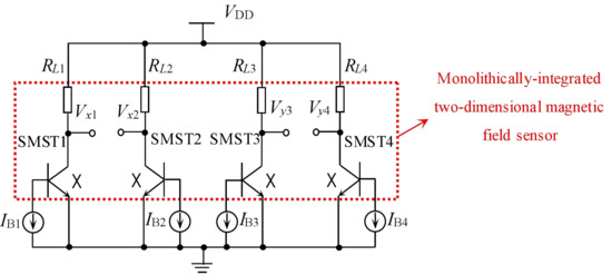 Figure 2 presents an equivalent circuit of the proposed sensor, where the red dashed box consists of four SMSTs and four collector load resistors for the monolithically-integrated chip, in which RL1, RL2, RL3 and RL4 are the collector load resistors of four SMSTs, respectively. One end of RL1, RL2, RL3 and RL4 is connected to C1, C2, C3 and C4 of the SMSTs, respectively, and the other ends of RL1, RL2, RL3 and RL4 are connected to the supply power. Vx1, Vx2, Vy3 and Vy4 are the collector output voltages for SMST1, SMST2, SMST3 and SMST4, respectively. IB1, IB2, IB3 and IB4 are current sources that provide the base injection currents for B1, B2, B3 and B4, respectively. VDD is the supply voltage. The four emitters of SMSTs are commonly grounded.