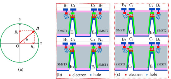 As shown in Figure 3c, when B ≠ 0 T, under the action of Bx (Bx > 0), the carrier of SMST1 (SMST2) is deflected by the Lorentz force, leading to a decrease (increase) in the number of carriers collected by the collector region, so that IC1 decreases (IC2 increases). Similarly, under the action of By (By > 0), IC3 and IC4 of SMST3 and SMST4 are decreased and increased, respectively. Vx and Vy are expressed as: