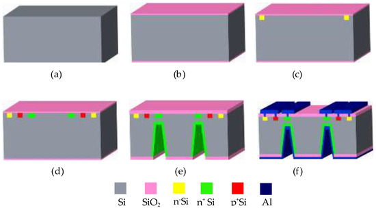 Main fabrication technology process of the proposed sensor chip: (a) cleaning the silicon wafer; (b) growing thin oxide; (c) lithography and ion implantation form load resistors and collector regions; (d) making the base regions by lithography and ion implantation; (e) lithography and ion implantation to form four emitter regions; (f) lithography and deposition of Al electrodes and metallization to form an ohmic contact.