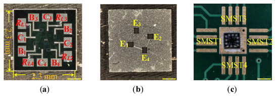 Figure 5a shows the front photograph of the fabricated sensor. The area of the chip is 2.3 mm × 2.3 mm. B1, B2, B3 and B4 are the bases, C1, C2, C3 and C4 are the collectors and RL1, RL2, RL3 and RL4 are the collector load resistors of the four SMSTs. As shown in Figure 5b, E1, E2, E3 and E4 are the emitters of the four SMSTs, respectively. They form the common emitters. The chip was packaged on printed circuit boards (PCBs) using internal lead bonding technology, and a photograph is shown in Figure 5c.