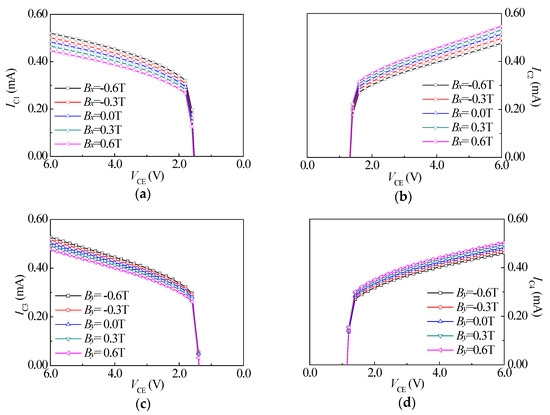 In a range of supply collector voltage of 0 V–6.0 V (the test step is 0.2 V) and a base injection current (IB) of 8.0 mA, the effect of the external magnetic field (B = 0 T, B = ±0.3 T and B = ±0.6 T) on the IC-VCE characteristics of SMSTs was researched. When a magnetic field is applied on the chip along the x-axis direction, Figure 7a,b shows the IC-VCE characteristic curves of SMST1 and SMST2 at different Bx (and By = 0 T). We can see that SMST1 and SMST2 have the opposite magnetic sensitive characteristics. When VCE > 1.8 V, the IC1 of SMST1 keeps increasing in the whole magnetic field range from the positive magnetic field to the negative magnetic field. However, in the same condition, the IC2 of SMST2 keeps decreasing. It was also shown that when VCE was a fixed value and Bx > 0 T, the IC1 of SMST1 decreased with Bx and the IC2 of SMST2 increased with Bx. When Bx < 0 T, the IC1 of SMST1 increased with Bx and the IC2 of SMST2 decreased with Bx. Furthermore, when a magnetic field B was applied along the y-axis direction (and Bx = 0 T), the IC-VCE characteristic curves of SMST3 and SMST4 were as shown in Figure 7c,d. Similarly, SMST3 and SMST4 also had the opposite magnetic sensitive characteristics. Moreover, the IC-VCE characteristic curves of SMST3 and SMST4 were similar to those of SMST1 and SMST2, respectively.