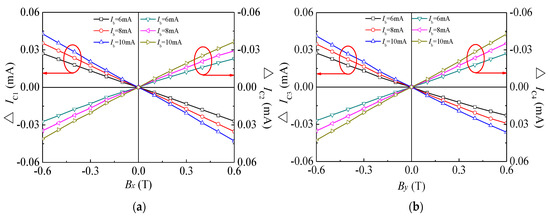 Figure 8 shows the relationship curves between the variation of collector currents for four SMSTs and magnetic field Bx (By), where ∆IC1, ∆IC2, ∆IC3 and ∆IC4 are four collector current variations, respectively. At VCE = 5.0 V, we analyze the effects of IB on magnetic sensitivity. Figure 8a clearly reveals that when Bx > 0 T (or Bx < 0 T), ∆IC1 is less than zero (or greater than zero) and ∆IC2 value is greater than zero (or less than zero). When Bx is a fixed value, the absolute value of ∆IC1 and ∆IC2 increases with IB. As shown in Figure 8b, under the same conditions, ∆IC3 and ∆IC4 are similar to those of ∆IC1 and ∆IC2, respectively. The experimental results showed that VCE and Bx (By) were fixed values, the absolute value of ∆IC1, ∆IC2, ∆IC3 and ∆IC4 linearly increasing with IB.