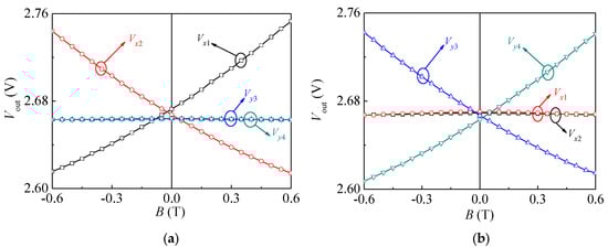 When B = 0 T, in ideal conditions, the carriers (electrons and holes) are not affected by the Lorentz force and are not deflected, so the collector currents of the four SMSTs are equal (IC1 = IC2 = IC3 = IC4 = IC0). As shown in Figure 3b, under the condition of RL1 = RL2 = RL3 = RL4 = R0, the output voltages (Vx and Vy) of the proposed sensor are as follows: