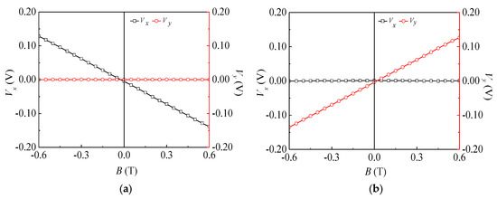 Relationship curves of Vx~B, Vy~B of the 2D magnetic field sensor: (a) B = Bx; (b) B = By.