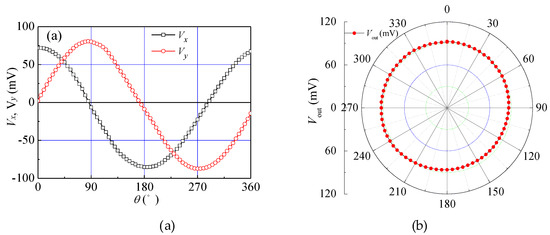 When VDD = 5.0 V and IB = 8.0 mA, Figure 11a,b shows the relationship curves between Vx (Vy) and rotation angle θ (from 0° to 360° with a step of 5°). Under the condition of B = 0.4 T, we rotated the chip, when θ = 0° (B = Bx and By = 0 T), Vx was maximum and Vy was approximately zero. With the increasing of θ, Vy increased and Vx decreased. When θ = 45°, in theory, , the experimental results showed that Vx = 53.1 mV and Vy = 58.9 mV. When θ = 90°, the experimental results showed that Vx = −6.5 mV and Vy = 80.1 mV. From Figure 11a, we can see that Vx and Vy varied with θ and conformed to the sine and cosine functional relationship. Through the analysis of the experimental results, the proposed sensor could detect Bx and By in the xy plane, respectively. According to Equation (6), we calculated the Vout of the sensor at different rotation angles. Figure 11b shows the relationship curves between Vout and θ, and Vout was close to the circular. The results showed that the magnetic sensitivities along the x-axis and y-axis direction of the 2D magnetic field sensor approached uniformity.