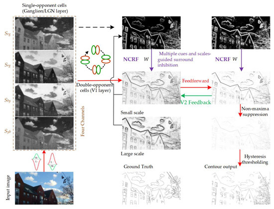 The general flowchart of the contour detection algorithm proposed in this paper is summarized in Figure 1. The proposed model mimicking the human visual processing stages is a hierarchical visual architecture. According to differentiation between anatomical structure and physiological function, the frontal cortex or brain areas responsible for contour and boundary detection in the HVS include the Retina, LGN, V1, and V2, etc. First, the input image is perceived and captured by single-opponent ganglion cells and LGN cells, which also carry out a convolution operation to form an image with four paths of different colours for the opponent channels; it is then further processed by the double-opponent V1 cells with different orientation sensitivities to preliminarily obtain the local edges of colour and luminance for the image. Next, to better solve the problems of texture suppression and contour integration in complex natural scenes, we use a multi-feature suppression and integration method under the guidance of multi-scale information and put forward a distance-weighted colour-oriented encoding method that automatically modulates the suppression strength of each pixel position using the surround inhibition weight obtained after integration. Finally, the feedforward and feedback processing of the V2 in response to the edges and textures of the cells in V1 is introduced, and methods such as non-maxima suppression and hysteresis threshold are used for processing the contours, such as refinement and integration, to obtain the hierarchical expression of the final image contours.