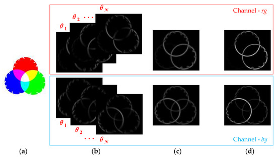 The normalisation operation can strengthen the wanted edges while weakening the internal texture information. Figure 2 represents the V1 RFs’ responses at each stage. In the same way, the responses of the other three colour opponent channels—Dgr (r-off/g-on), Dby (b-on/y-off), and Dyb (b-off/y-on)—can be obtained through the above equations.