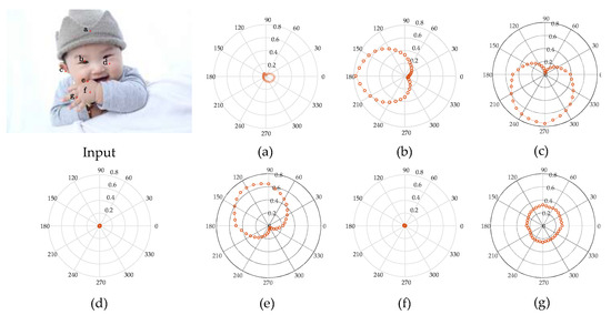 To verify that the hierarchical contour detection model constructed in this paper can better simulate the feature perception and expression capacities of the cells at early visual stages and can better fit the biological characteristics, in connection with the more complex structures of a natural human image as shown in Figure 4, the CRF response characteristics of V1 complex cells for different areas of the image are analysed in specific experiments, and the results are as shown in Figure 4a–g, which correspond to the responses of the pixel points at positions a–g in the human image, and the polar coordinate values correspond to a group of 36 V1-cell model response values in different preferred directions. It can be seen in Figure 4 that the CRF of V1 cells is not simply an isotropic concentric circular structure but has obvious orientation selectivity, and this characteristic is most strongly manifested when the direction of the visual stimuli and the preferred direction of the cell are consistent; however, it shows a gradually decreasing trend when the response characteristics are in other directions. This kind of CRF characteristic is an important foundation for V1 cells to have the detection capability for image edges and contours. In border areas with greater changes in colour and luminance, the response of V1 cells consistent in direction with the visual stimuli has obvious orientation characteristics. For example, in connection with pixel point b at the edges of the human eye, cells with a preferred direction of 180° have the highest response value of 0.77 (as shown in Figure 4b); in connection with pixel point c at the boundary of the auricle, cells with a preferred direction of 270° have the maximal response value of 0.76 (as shown in Figure 4c); in connection with pixel point e at the edges of the hand, the greatest response value is 0.68 for cells with a preferred direction of 120° (as shown in Figure 4e), and so on. In areas with smaller changes in colour and luminance—that is, the internal area of the contour—all response values for direction-sensitive V1 cells are very small, such as pixel point a inside the brim of the hat in Figure 4a, pixel point d inside the cheek in Figure 4d, and pixel point f inside the hand in Figure 4f. In areas with disorderly changes in colour and luminance, all direction-sensitive V1 cells have a certain response, but the distinction in response value with difference preferred directions is small. In this case, it is difficult to differentiate the direction of the edge; for example, the response value of pixel point g between the fingers in Figure 4g is between 0.22 and 0.31.