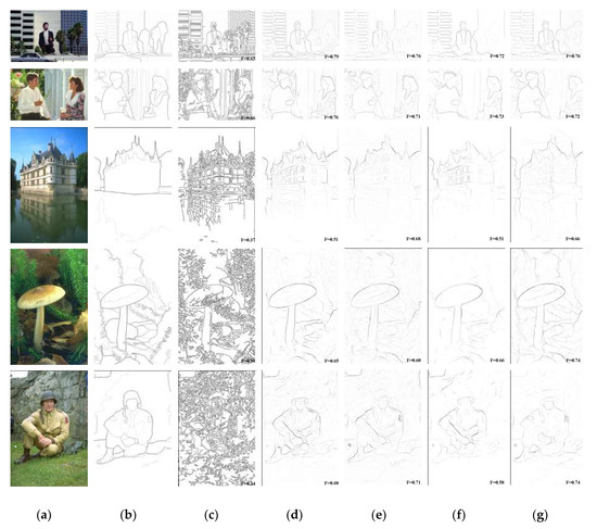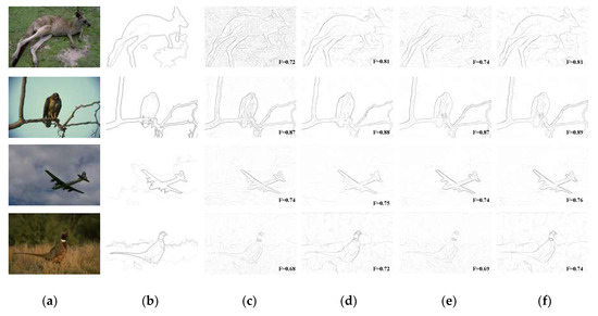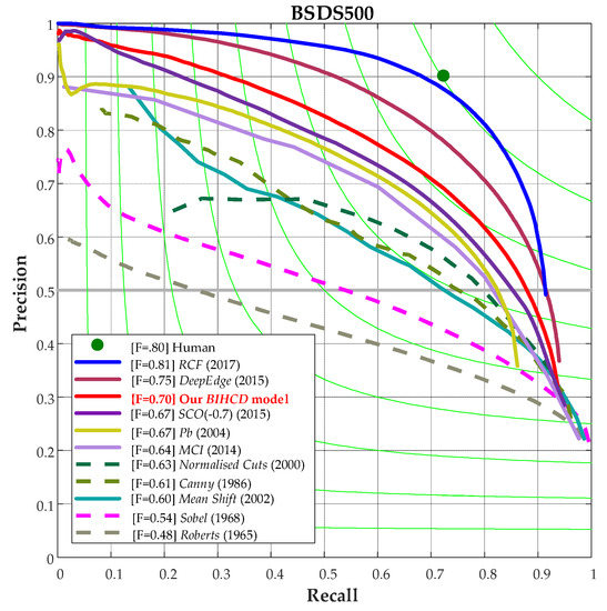 Natural images are complex and varied. To verify the actual performance of the BIHCD model in this paper, we selected the standard image database (Berkeley Segmentation Data Set 300/500 (BSDS300/500)) provided by the University of California, Berkeley, to test the performance of image contour detection in complex natural scenes. BSDS300 datasets contains 300 natural images (200 training and 100 test images) and BSDS500 additionally adds 200 test images. Each image provides 5–10 human-marked standard contour (Human) data, which lead to the presence of greater artificial subjective factors in the contours marked in the Human map, as shown in Figure 6. For example, in the mushroom sample in the last row of Figure 6, cluttered background such as weeds are marked as contours. Therefore, in subsequent experiments, we will average all Human map of the same image as its ‘Ground Truth’. In combination with the Human map, we calculated the aforementioned evaluation index (F-measure) in the experiment and drew a diagram of the corresponding precision-recall (P-R) curve, which directly reflected the consistency between the contours detected and obtained by different algorithms and the Human map.