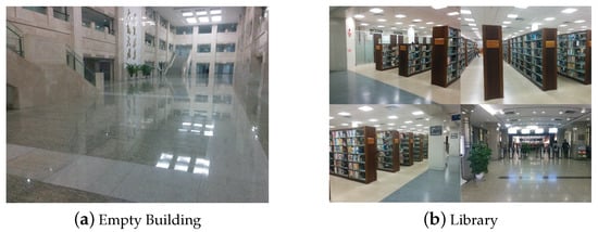 To figure out the relationship between estimated locations and real physical location, we used the prototype of acoustic-based localization method proposed in [19] to conduct extensive evaluations at three indoor conditions: LOS, mild NLOS and severe NLOS. LOS represents a scenario that no acoustic source is blocked. When fewer than three sources are blocked, we deem this scenario to be mild NLOS. Accordingly, we define severe NLOS situation that has more than three acoustic sources are blocked. Moreover, as shown in Figure 2, our evaluations were conducted in two indoor circumstances: building lobby and library. We repeat the localization process at three fixed points under different levels of noise interference. The setting of acoustic anchors and the located points are illustrated in Figure 3. We pre-deployed four acoustic sources at (0,−3), (6,0), (24,0), and (30,−3), which are marked as diamonds in the figure. The coordinates of located locations at (6,−7), (18,−7) and (12,−4) are marked as red solid circles.