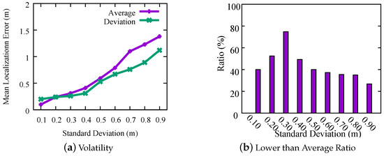 Moreover, for each , we also compute the averaged and the volatility of localization results by and of . The averaged denotes the overall location accurate when all estimated results satisfy the given restriction of , and the deviation denotes the volatility of all localization results. As shown by Figure 4a, the averaged increases with the rising of , and the volatility of first steadily increases when increases from 0.1 m to 0.3 m, and then significantly increases from 0.2 m to 1 m when increases from 0.3 m to 0.9 m. In addition, for a given , we further compute the probability that the actual of each calculated result is less than the given , and plot the distribution in Figure 4b. As shown by it, when is 0.3m, the actual s of about 80% results are less than 0.3 m. The probability of 0.3 m is significantly higher than other cases. Based on these results, in the Decision Scheme (see Section 4.3), we set the threshold to 0.3.