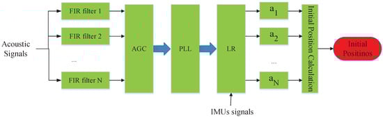 Although we can estimate the relative direction between a device and an acoustic anchor, SITE needs to further calculate a set of relative directions using at least three acoustic sources to localize user. In a localization system, several acoustic anchors are pre-deployed. Hence, SITE needs to compute the relative directions between multiple nearby acoustic sources to the device simultaneously. As shown in Figure 6, the received acoustic signals parallel walk through many FIR filters (FIR filter 1, FIR filter 2, ⋯, and FIR filter N), each with different frequency bandwidth thresholds. The threshold value is set according to the frequency of pre-defined acoustic sources. Then, through sequentially processing by AGC, PLL and LR, the filtered signals by different FIR filter will generate a set of relative directions (). Eventually, with these relative directions, SITE can compute location using the difference of relative directions, we will give an introduction in the following section.