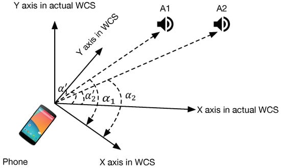 Illustration of the calculated WCS and the actual WCS. The calculated WCS is transformed by the User’s phone Coordinate System using the compass. The and represent the calculated relative directions in the WCS, and and are their corresponding actual relative directions in the actual WCS, respectively.