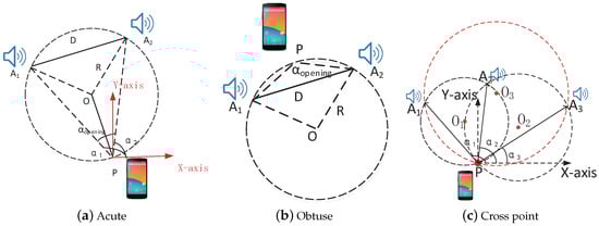In Figure 8a, there are two acoustic sources, and , and their corresponding directions relative to mobile phone P (with unknown coordinate ) are and . By computing the distance and the opening angle , we can infer that P locates on a fixed circle, whose radius (R) can be calculated with the distance D and the opening angle . Then, as and are known, we get two possible results for circumcenter O. If is an acute angle, the circumcenter O and P are on the same side of as shown in Figure 8a. Otherwise, they are on the opposite side, as shown in Figure 8b.