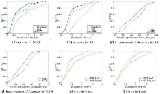 Analysis: As shown in Figure 10, SITE is feasible and achieves a better performance than other methods on the same condition and experimental setup. In Figure 10a,b, we, respectively, compare SITE’s localization accuracy with two other methods (Swadloon and the method in [23]) in NLOS (Figure 10a) and LOS ((Figure 10b) condition. As expected, SITE achieves the best performance in these two conditions. In addition, we can also observe that SITE achieves a higher improvement in LOS than does in NLoS. This is due to changing of the indoor environment and the pedestrian movement in NLOS situation, the reconstructed 3D space using VSFM technique only with images is becomes less accurate than that in LOS situation, making the relative relationship inaccurate. Next, we analyzed the improvement of localization accuracy in different conditions and compared with the proposed method in [23]. In Figure 10c,d, we can intuitively see that SITE achieves a higher improvement in both conditions. The median improvement of SITE in LOS and NLOS condition respectively are and , which are and by [23]. According to our results in Figure 10e,f for localization error of X-axis and Y-axis, it is easily found that SITE has a better performance of localization accuracy in X-axis than its in Y-axis, such as SITE achieves a median error of 0.30 m and 0.40 m in X-axis in LoS and NLOS condition, which degrade to 0.42 m and 0.48 m in Y-axis, respectively. Here, this phenomenon of downgrading is probably because the layout has all anchors deployed on the same side in our experiments. Therefore, it is necessary to research on how the layout affects the performance of the localization method and the optimal approach to achieve the best performance.