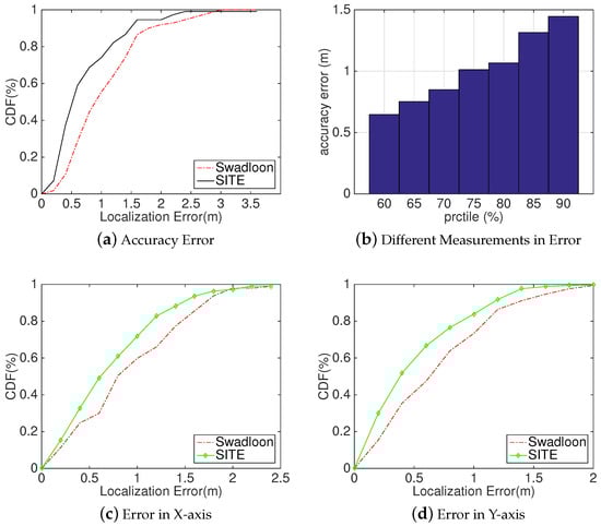 Analysis: As Figure 11 depicts, we separately computed the localization errors in distance (Figure 11a), X-axis (Figure 11c) and Y-axis (Figure 11d). From these figures, we can intuitively observe that SITE is still feasible in a stressful environment, and also performs better than Swadloon. For example, SITE achieves the localization error within 0.47 m, 0.85 m, and 1.44 m at the percentaged of , , and respectively, whereas Swadloon degrades to 0.94 m, 1.32 m and 1.8 m, correspondingly. In contrast to Figure 10a,b, the line of improvement performs much more smooth than does in the lobby of a building. The reason for this phenomenon is that the environment of a library will not change frequently, results in much more concomitant features and acquiring much more accurate and stable reconstructed 3D space. Hence, SITE could have a stable performance on improving the localization accuracy. Furthermore, according to Figure 11c,d, SITE achieves a median error of 55 cm in X-axis and 48 cm in Y-axis compared to 76 cm and 68 cm in Swadloon.