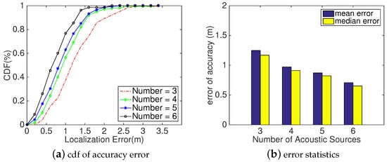 Method: According to the presented localization method in Section 4, at least five acoustic sources are needed to localize the user using our proposed Decision Scheme introduced in Section 4.3; by varying number of acoustic anchors, we could compare the localization performance of SITE in the following three situations: (a) localizing the user only relying on acoustic signals while there are three acoustic sources; (b) refining coordinate directly using VSFM as four acoustic sources are deployed; and (c) using our proposed localization scheme with at least five sources anchors. Therefore, we varied the acoustic sources from 3 to 6 for a comparative analysis of SITE’s localization performance.