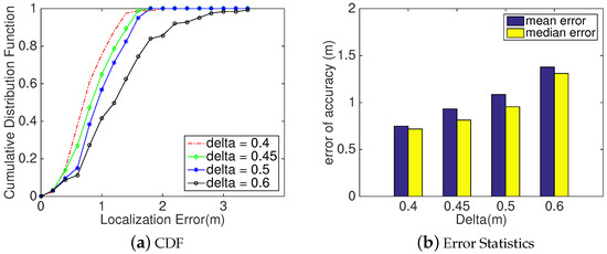 Method: As shown in Section 4.3.2, aiming to obtain more sets to find an optimal coordinate as one input of Location Refinement in Section 4.4, we brought in another threshold to mark all four-sized sets according to the decision scheme in Section 4.3. In our implementation, we set the threshold to 0.45 m as the mean localization error is likely less than 0.5 m. However, aiming to evaluate its impact on the accuracy of SITE, we chose as 0.4 m, 0.45 m, 0.5 m, and 0.6 m, respectively, and conducted the localization process to gather localization results. Then, we comprehensively analyzed the gathered locations.